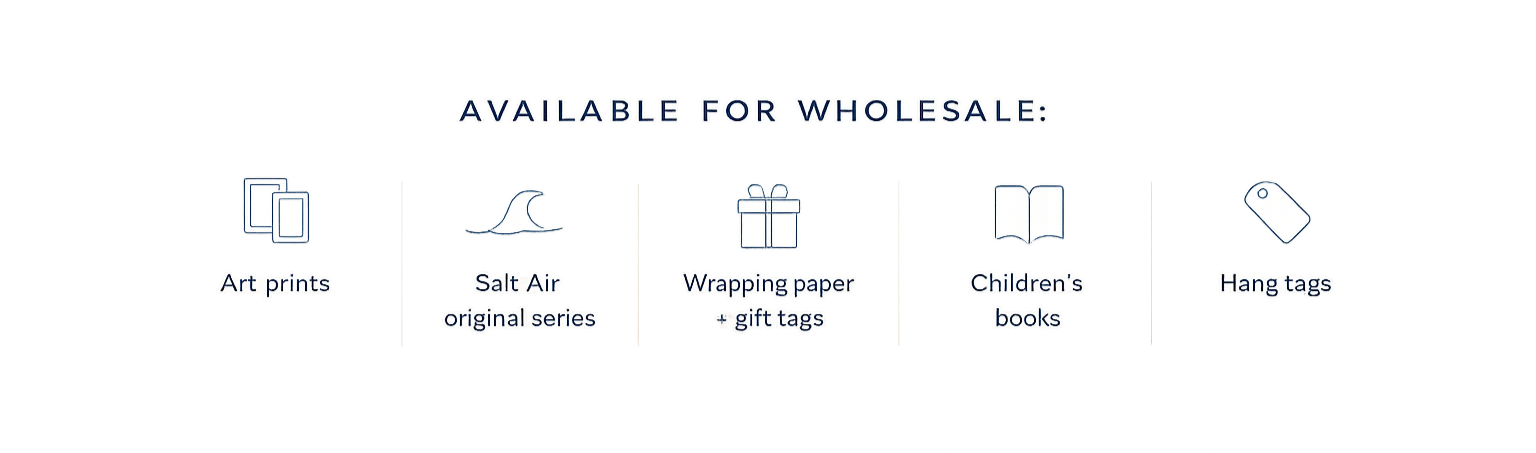 I offer a curated selection of prints, small originals, and paper goods designed to bring light, color, and a sense of place into your store.